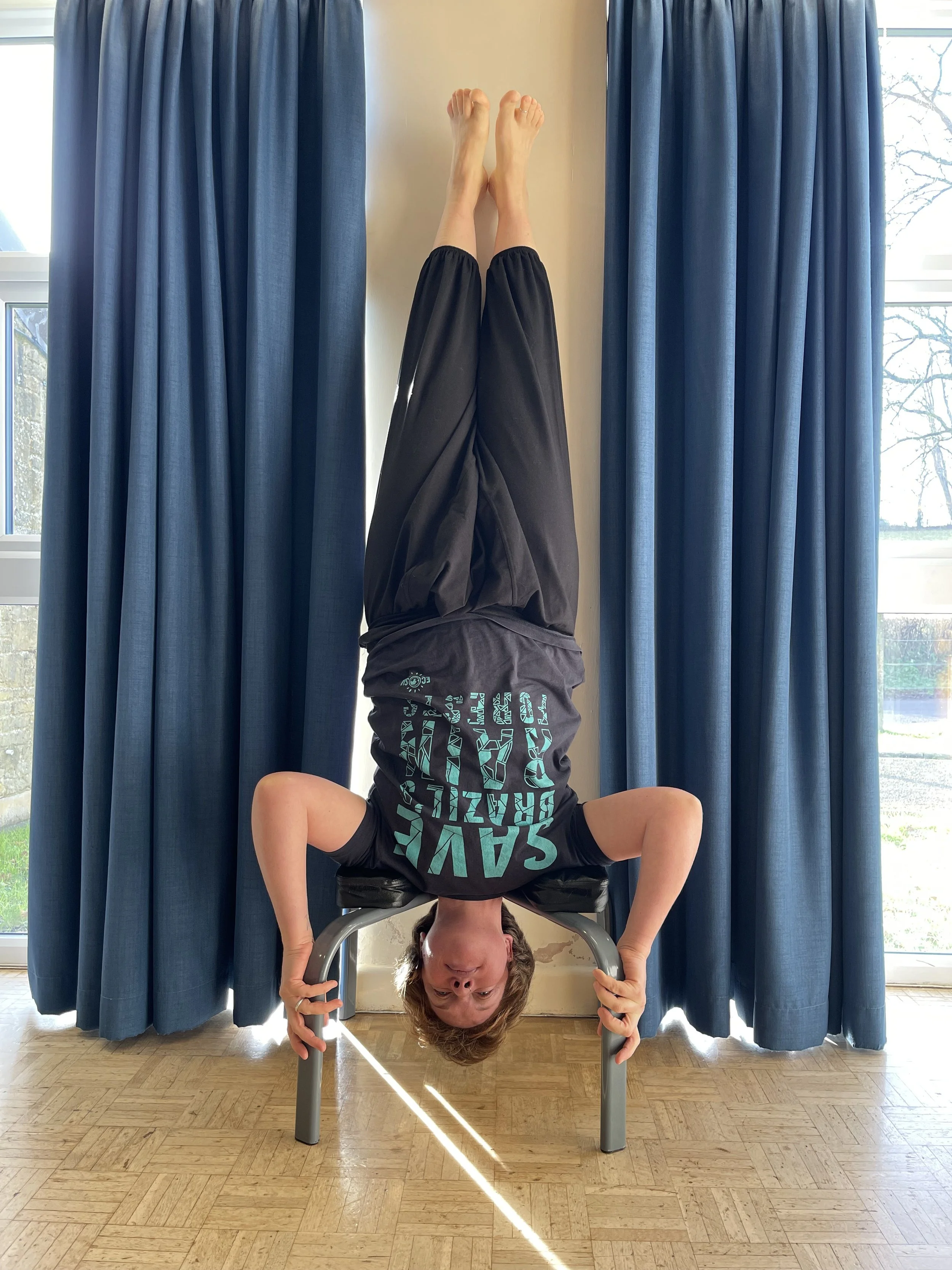 Sarah with her favourite prop - the feet up stool - which enables her to practice headstand