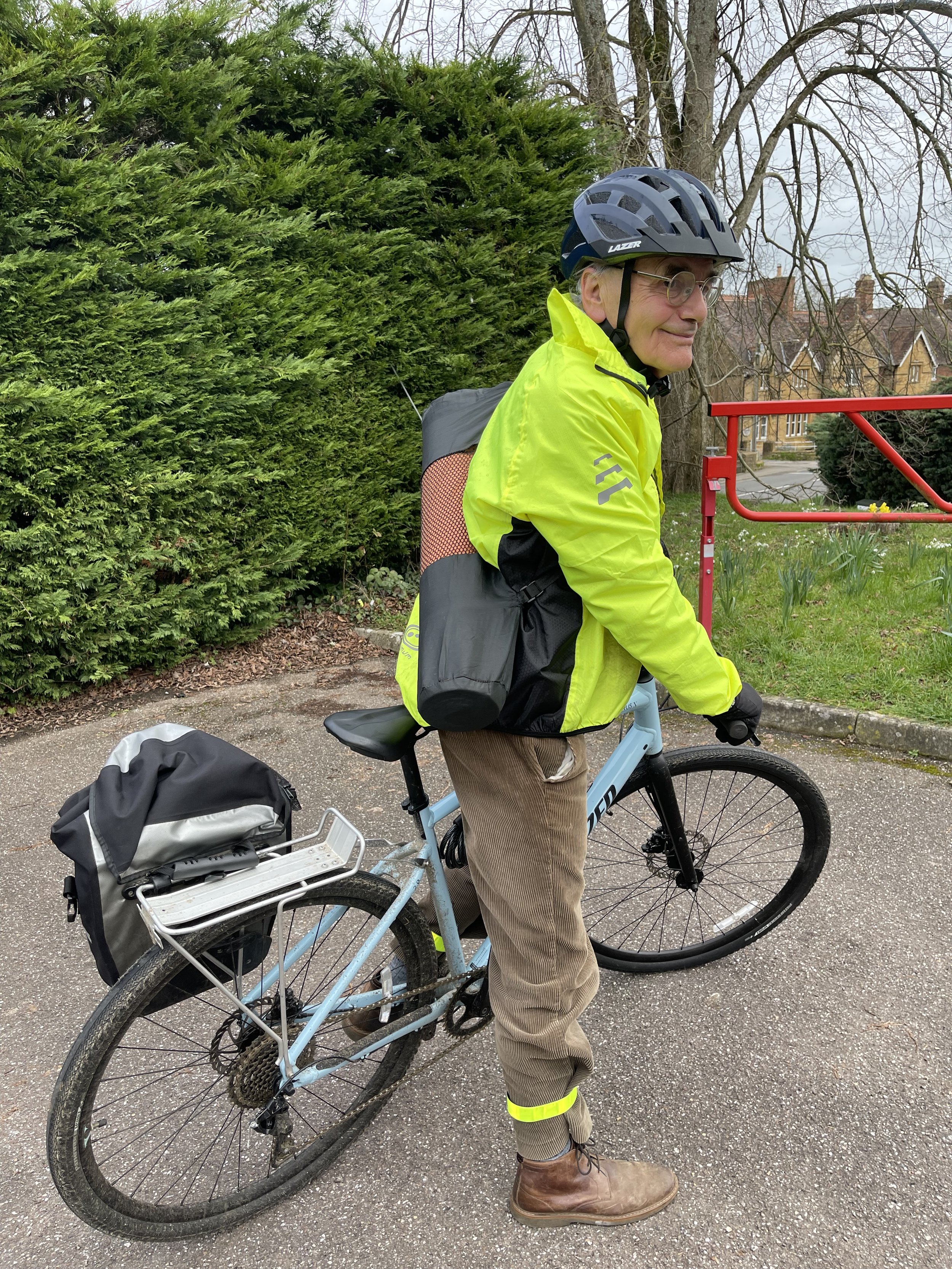 Howard cycles to class with his yoga kit