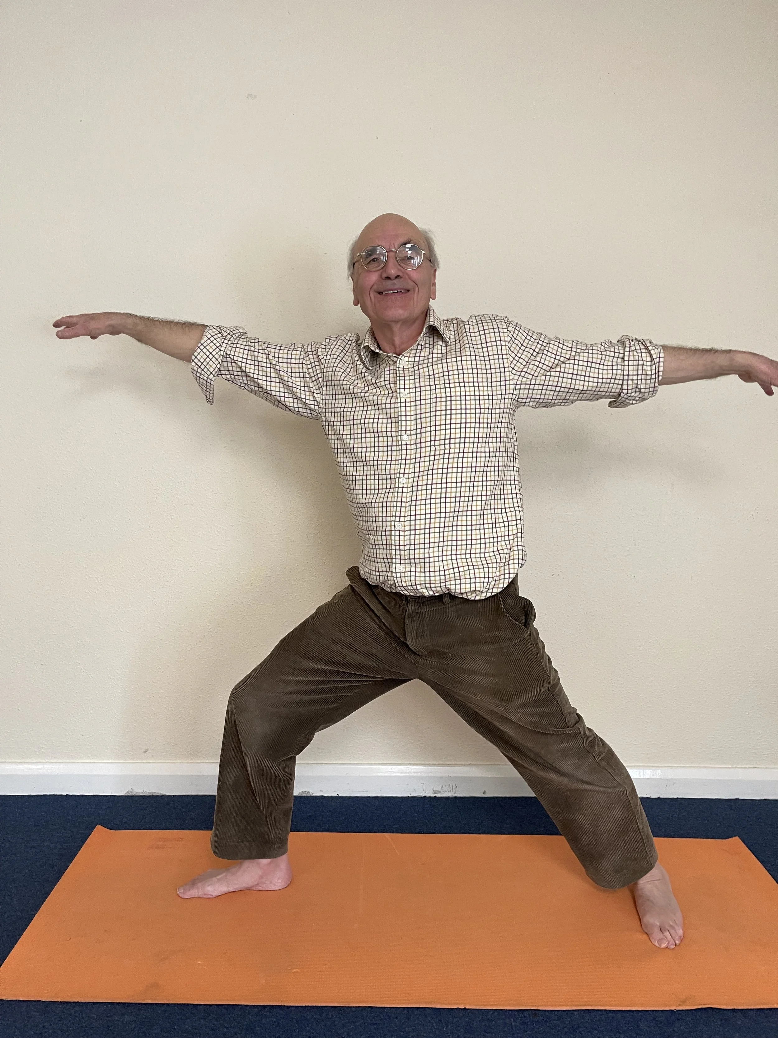 Howard is one of those students who quietly challenges the stereotype of who yoga is “for” and expands your idea of what a “yoga student” looks like. Retired, active, and arriving by bicycle, he comes fully prepared; mat, blocks, belt, everything on board and approaches his practice with genuine commitment. Always in his trademark corduroys, he’s unapologetically himself, which I absolutely love.