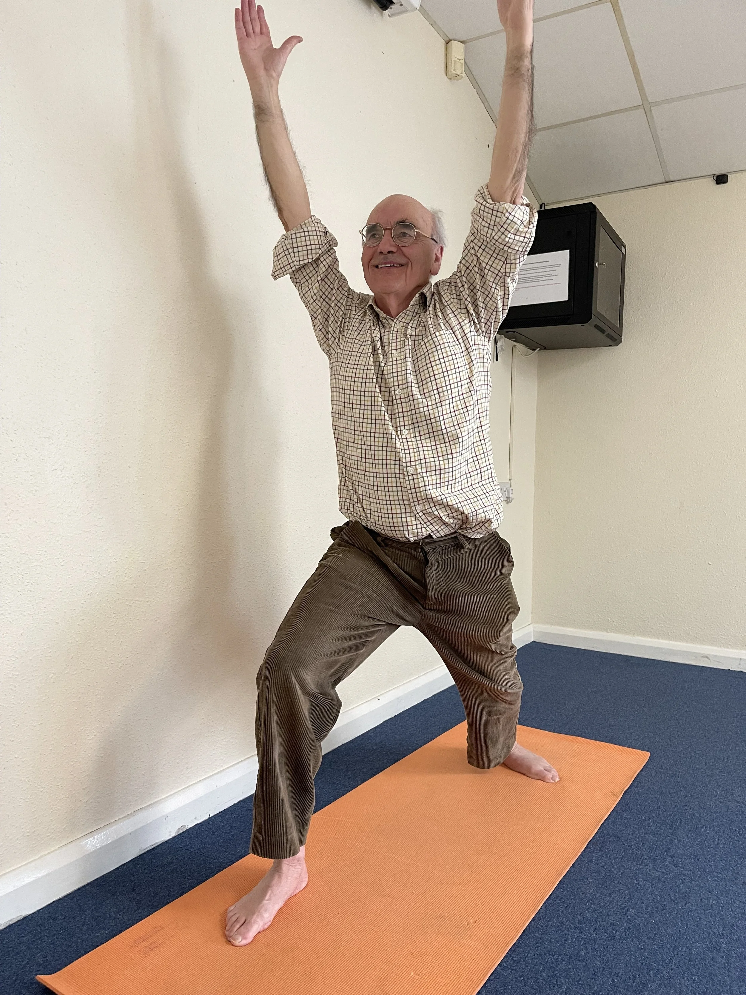 As Howard has shared, he originally came to yoga through an Age UK (formerly Age Concern UK) class that I later took on. It was a good class, offering important movement and connection, though it was largely practised seated in chairs. I’m a strong believer that when we can do things standing, it’s so valuable to do them standing. Weight-bearing, balance, and strength matter deeply as we age. That’s why it’s been such a joy to hear Howard say how much he now enjoys the warrior poses, strong standing postures that build confidence, stability, and a sense of capability. What’s equally important is that the class always works at individual capacity. Some people continue to use chairs, others explore standing options, and everyone is supported in finding what’s right for them. That mix allows people to feel safe while also being invited to grow, and it creates an atmosphere where everyone feels included and genuinely enjoys working together.