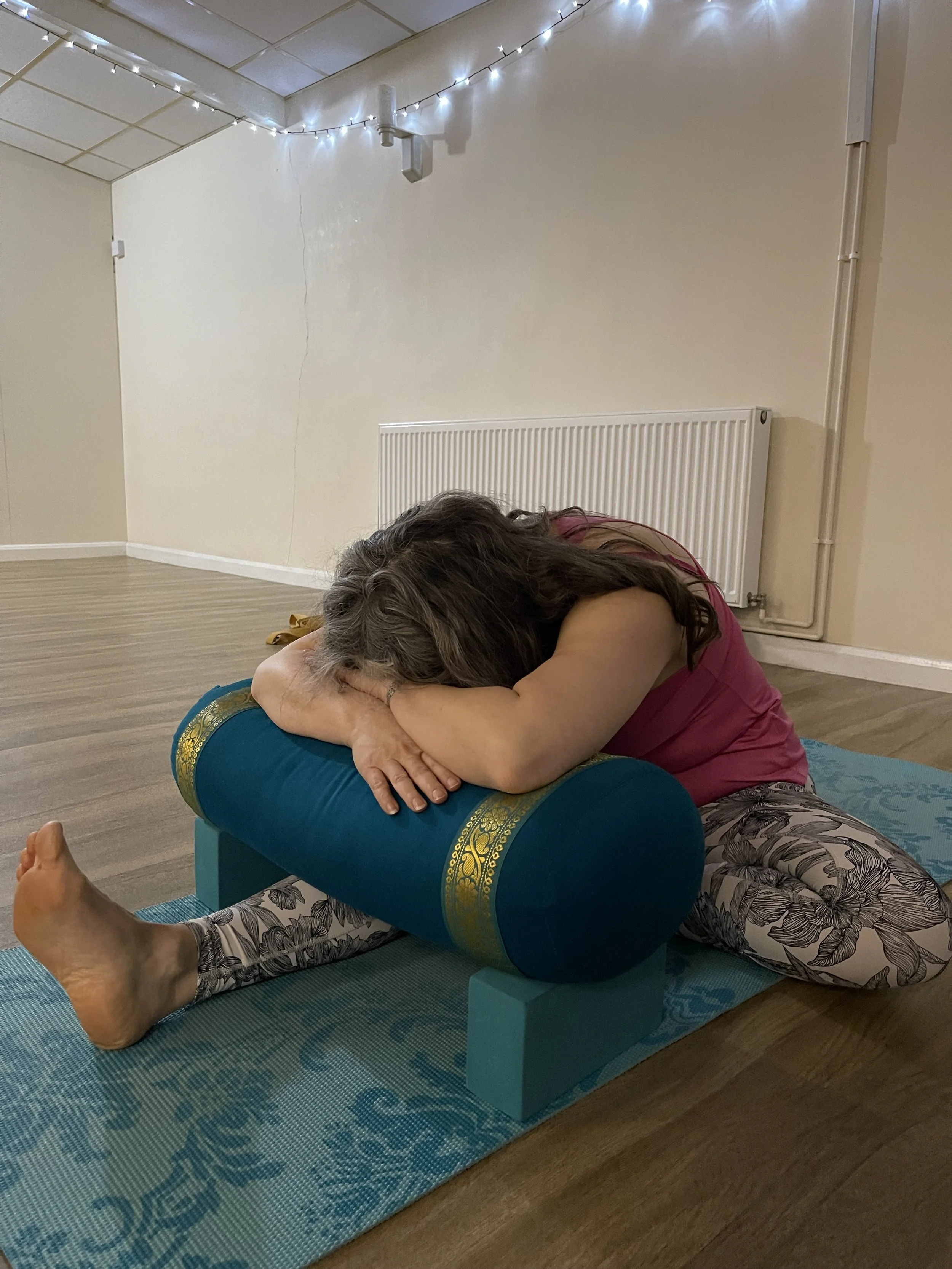 Christine’s favourite prop -the bolster - and one of her favourite poses - paschimottonāsana